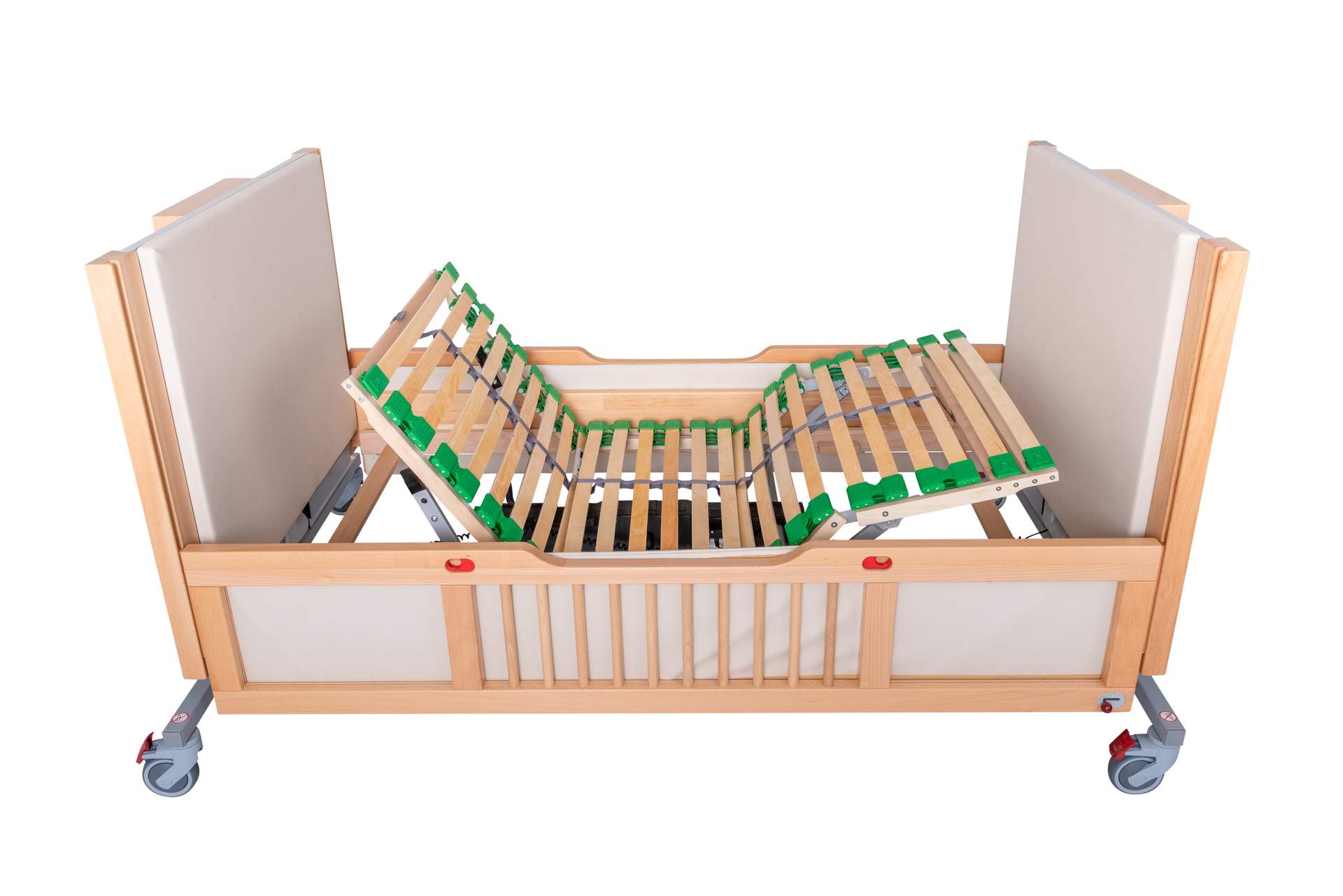 Variable posture beds can be adjusted to change the shape or profile of the bed according to the needs of the individual. The head end of the mattress can be elevated to support the back and shoulders of a person whilst they are sitting, and a knee break stops users from sliding down the bed. For further information see section ‘For people who need help to sit up or lie down in bed’.