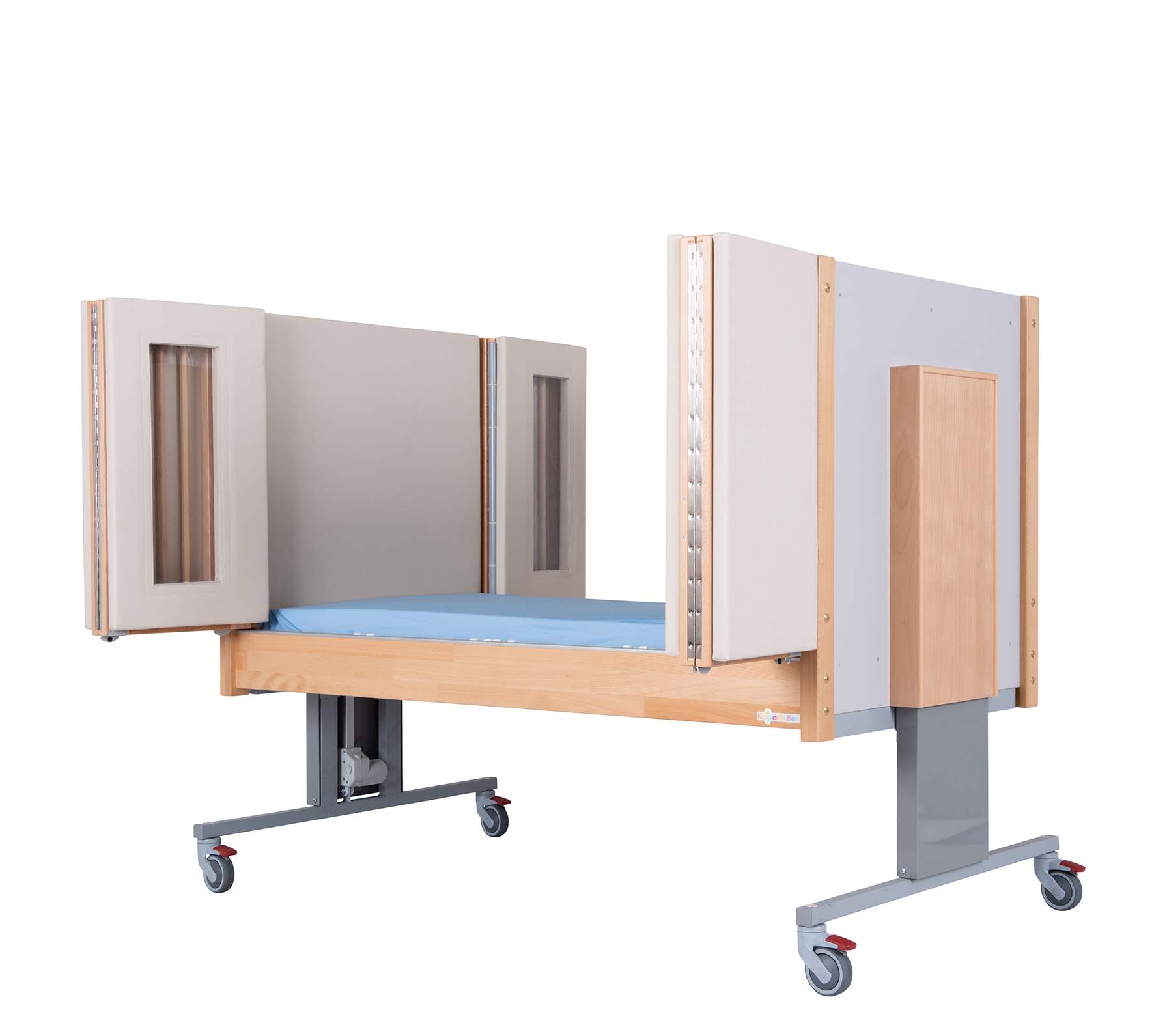 Cots suitable for children may be fixed height, or provide height adjustment of the mattress platform or the whole cot. These cots may be profiling, have a Trendelenburg/reverse Trendelenburg feature (where the entire bed can be tilted towards the head or feet) and lateral turning. The doors can be front opening, bi-fold, sliding or drop-down and can include clear Perspex panels and full or partial padding.