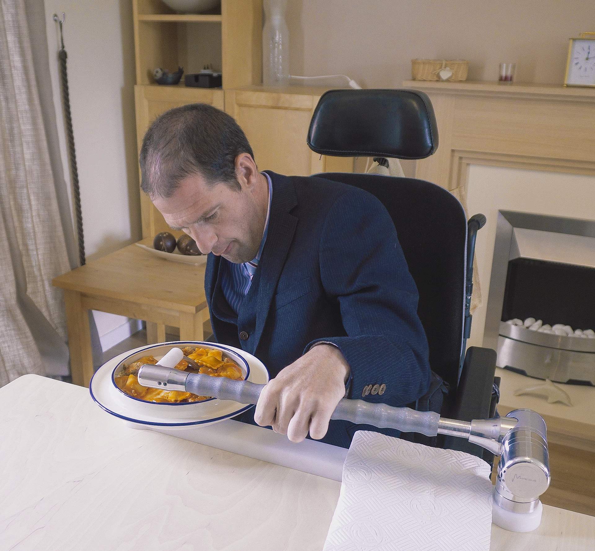 Eating systems can be manually or electrically operated, and are designed for use by people who have limited or uncontrollable arm or hand movement. Also included are individual components designed be used with other equipment, and powered mobile arm supports.