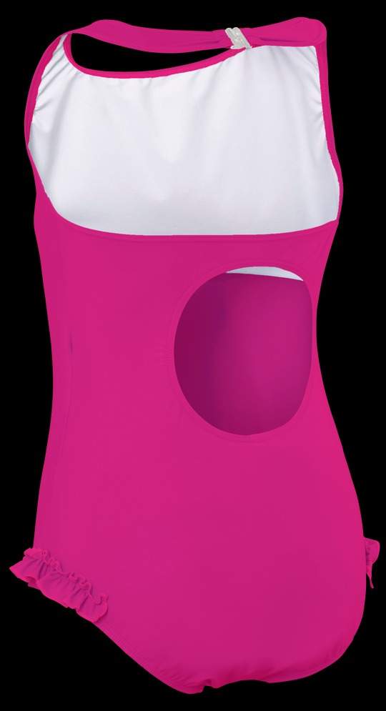 Adjustable incontinence girls swimsuit with built-in swim nappy. Comprises: outer shell made from PBT, inner swim nappy is made from PU coated polyur...
